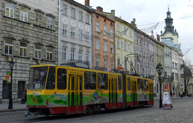 A L'viv tram on a small sett street in the old town. |