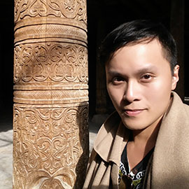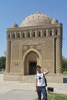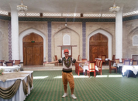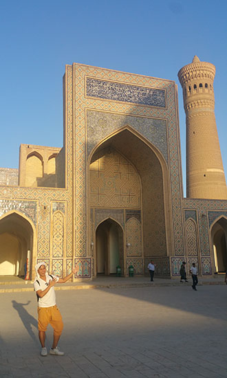 ![]() Bukhara can be tracked back to 4th cen. The old town of Bukhara scratches 2~3 km. The main square was surrounded by (i) Po-i-Kalyan Mosque, (ii) Kalyan Minaret, and (iii) Mir-i-Arab Madrassah. The landmark of Bukhara is the Kalyan Minaret, which was erected in 1127 on top of the grave of an imam (a priest) killed by the Khan. Here I am inside the mosque pointing to the minaret outside. |