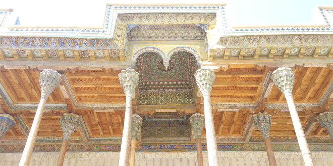 ![]() As Khiva, being an oasis in a desert, is quite hot during summer, the reception hall was designed with tall ceiling to channel wind from higher ground. In winter, a yurt would be set up at the open area with fire heating in the center. |